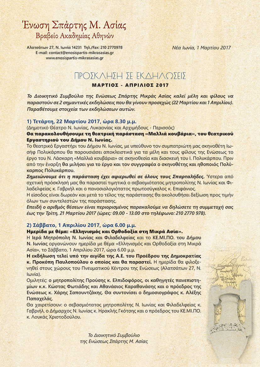 Ανακοινώσεις Εκδηλώσεις Ένωσης Σπάρτης Μ. Ασίας Μάρτιος – Απρίλιος 2017 by Ένωση Σπάρτης 15 Μαρτίου, 2017 written by Ένωση Σπάρτης 15 Μαρτίου, 2017 176 0 comments 0 FacebookTwitterPinterestEmail Ένωση Σπάρτης previous post Νέος πρόεδρος της Ο.Π.Σ.Ε. ο κ. Λουκάς Χριστοδούλου next post Βασίλης Βασιλειάδης. Ένας σπουδαίος ζωγράφος, ένας Ιωνιώτης δημιουργός, ένας μεγάλος Σπάρταλης . Related Articles ΝΕΟ ΔΙΟΙΚΗΤΙΚΟ ΣΥΜΒΟΥΛΙΟ 28 Ιουνίου, 2025 Η ΒΡΑΒΕΥΣΗ ΤΩΝ ΣΤΕΛΕΧΩΝ ΔΙΟΙΚΗΣΗΣΤΗΣ ΕΝΩΣΕΩΣ ΣΠΑΡΤΗΣ Μ.... 29 Μαΐου, 2025 ΠΑΡΟΥΣΙΑΣΗ ΠΡΑΚΤΙΚΩΝ ΣΥΝΕΔΡΙΟΥ ΜΙΚΡΑΣΙΑΤΙΚΗΣ ΜΝΗΜΗΣ 24 Μαΐου, 2025 ΕΤΗΣΙΑ ΕΟΡΤΗ “ΕΝΩΣΕΩΣ ΣΠΑΡΤΗΣ Μ. ΑΣΙΑΣ” ΜΝΗΜΟΣΥΝΟ –... 13 Μαΐου, 2025 Πρόσκληση 12 Μαΐου, 2025 ΚΟΠΗ ΠΙΤΑΣ ΕΝΩΣΗΣ ΣΠΑΡΤΗΣ Μ. ΑΣΙΑΣ 20 Ιανουαρίου, 2025 Πρόσκληση 9 Σεπτεμβρίου, 2024 8ΗΜΕΡΗ ΕΚΔΡΟΜΗ ΣΤΗΝ ΤΟΥΡΚΙΑΣΜΥΡΝΗ – ΣΠΑΡΤΗ – ΑΛΑΝΥΑ... 12 Αυγούστου, 2024 ΔΕΛΤΙΟ ΤΥΠΟΥ 16 Ιουνίου, 2024 ΨΗΦΙΣΜΑ 13 Ιουνίου, 2024