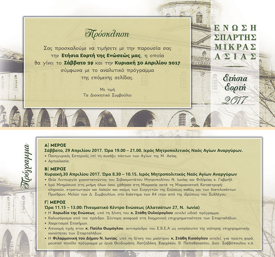 Ανακοινώσεις Ετήσια Εορτή Ένωσης Σπάρτης Μ. Ασίας, 30 Απριλίου 2017 by Ένωση Σπάρτης 24 Απριλίου, 2017 written by Ένωση Σπάρτης 24 Απριλίου, 2017 177 0 comments 0 FacebookTwitterPinterestEmail Ένωση Σπάρτης previous post Βασίλης Βασιλειάδης. Ένας σπουδαίος ζωγράφος, ένας Ιωνιώτης δημιουργός, ένας μεγάλος Σπάρταλης . next post Η Ένωση Σπάρτης Μ.Ασίας παρούσα στον εορτασμό του Μπλόκου της Καλογρέζας Related Articles ΝΕΟ ΔΙΟΙΚΗΤΙΚΟ ΣΥΜΒΟΥΛΙΟ 28 Ιουνίου, 2025 Η ΒΡΑΒΕΥΣΗ ΤΩΝ ΣΤΕΛΕΧΩΝ ΔΙΟΙΚΗΣΗΣΤΗΣ ΕΝΩΣΕΩΣ ΣΠΑΡΤΗΣ Μ.... 29 Μαΐου, 2025 ΠΑΡΟΥΣΙΑΣΗ ΠΡΑΚΤΙΚΩΝ ΣΥΝΕΔΡΙΟΥ ΜΙΚΡΑΣΙΑΤΙΚΗΣ ΜΝΗΜΗΣ 24 Μαΐου, 2025 ΕΤΗΣΙΑ ΕΟΡΤΗ “ΕΝΩΣΕΩΣ ΣΠΑΡΤΗΣ Μ. ΑΣΙΑΣ” ΜΝΗΜΟΣΥΝΟ –... 13 Μαΐου, 2025 Πρόσκληση 12 Μαΐου, 2025 ΚΟΠΗ ΠΙΤΑΣ ΕΝΩΣΗΣ ΣΠΑΡΤΗΣ Μ. ΑΣΙΑΣ 20 Ιανουαρίου, 2025 Πρόσκληση 9 Σεπτεμβρίου, 2024 8ΗΜΕΡΗ ΕΚΔΡΟΜΗ ΣΤΗΝ ΤΟΥΡΚΙΑΣΜΥΡΝΗ – ΣΠΑΡΤΗ – ΑΛΑΝΥΑ... 12 Αυγούστου, 2024 ΔΕΛΤΙΟ ΤΥΠΟΥ 16 Ιουνίου, 2024 ΨΗΦΙΣΜΑ 13 Ιουνίου, 2024
